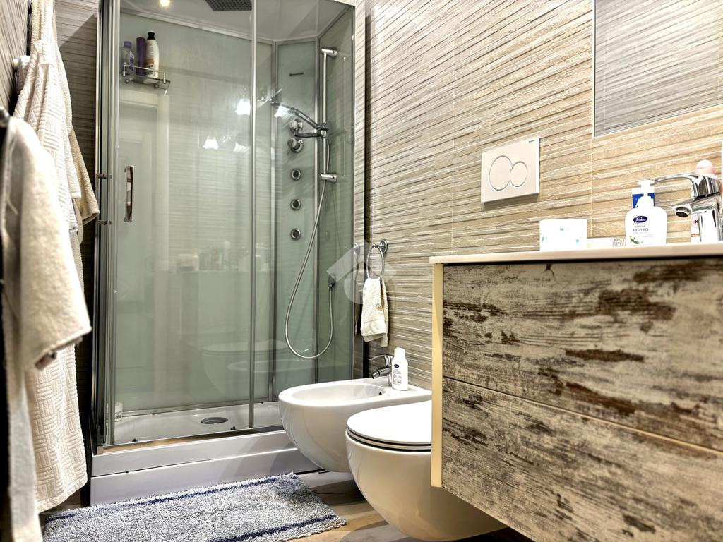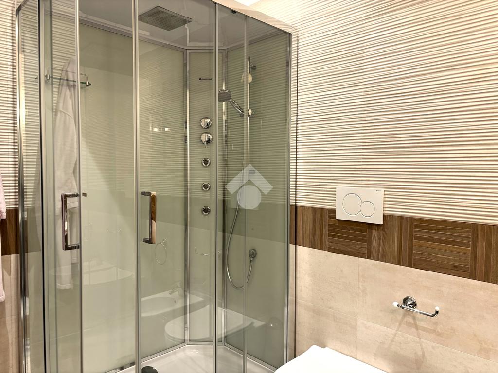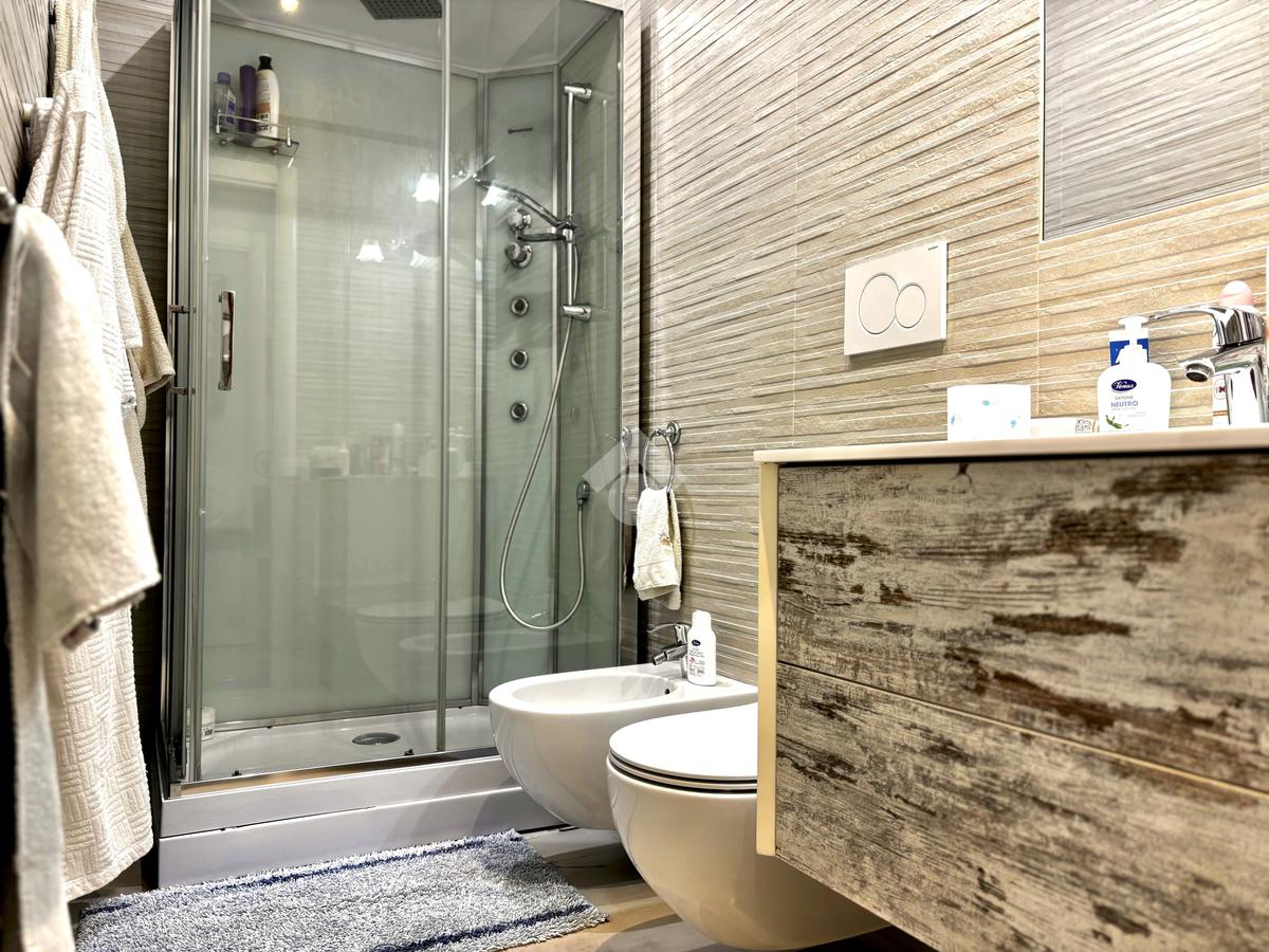Infine, il bagno padronale, dotato di un ampio box doccia multifunzione e doppio lavabo, rappresenta un'oasi di comfort e raffinatezza.