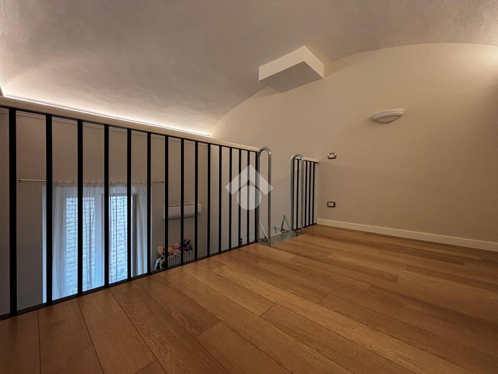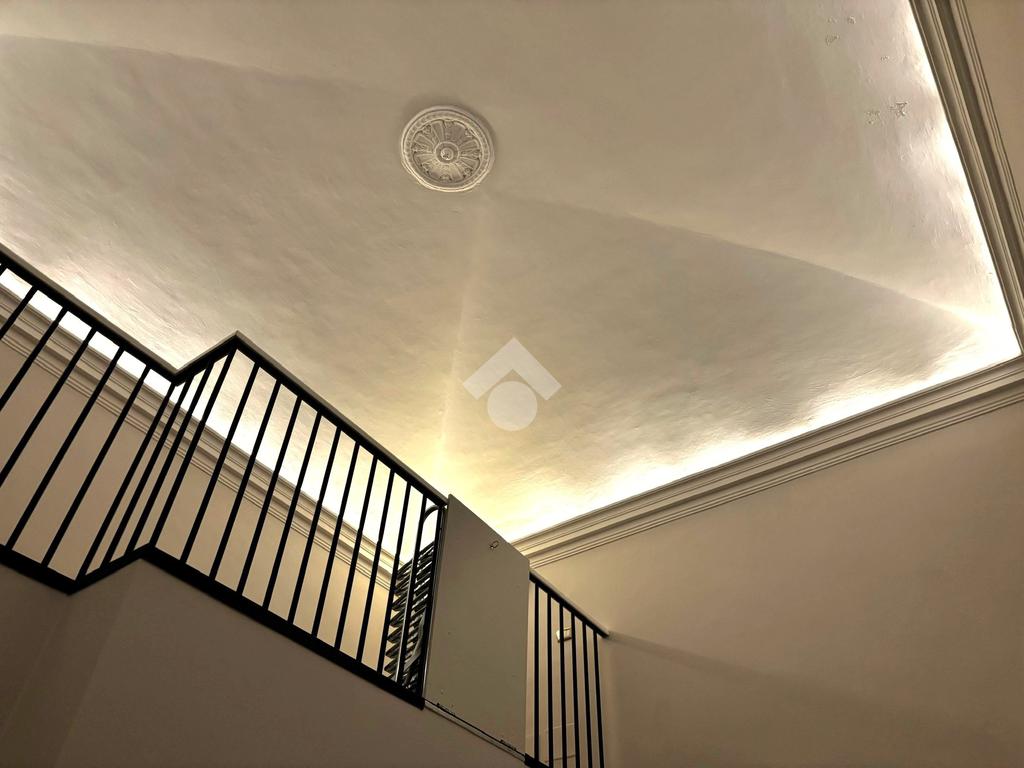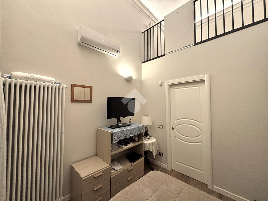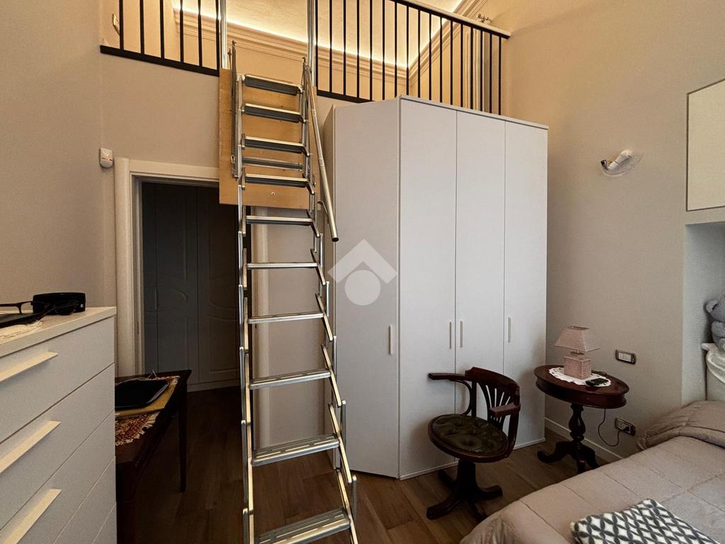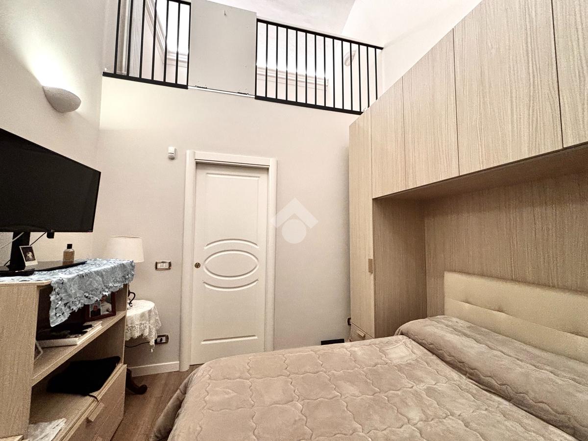 Proseguendo, troviamo il primo dei due bagni, un elegante ambiente con sanitari sospesi e un moderno box doccia multifunzione, ideale per il benessere quotidiano. Il corridoio conduce poi a due camere da letto di dimensioni simili, entrambe con affaccio sulla storica Via del Carmine. Anche in queste stanze si ripetono le suggestive volte alte e la presenza di soppalchi, che arricchiscono l'architettura dell'appartamento.