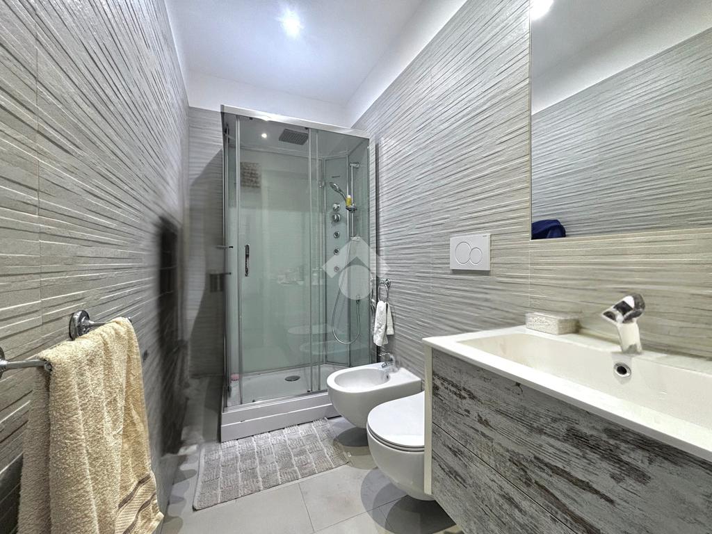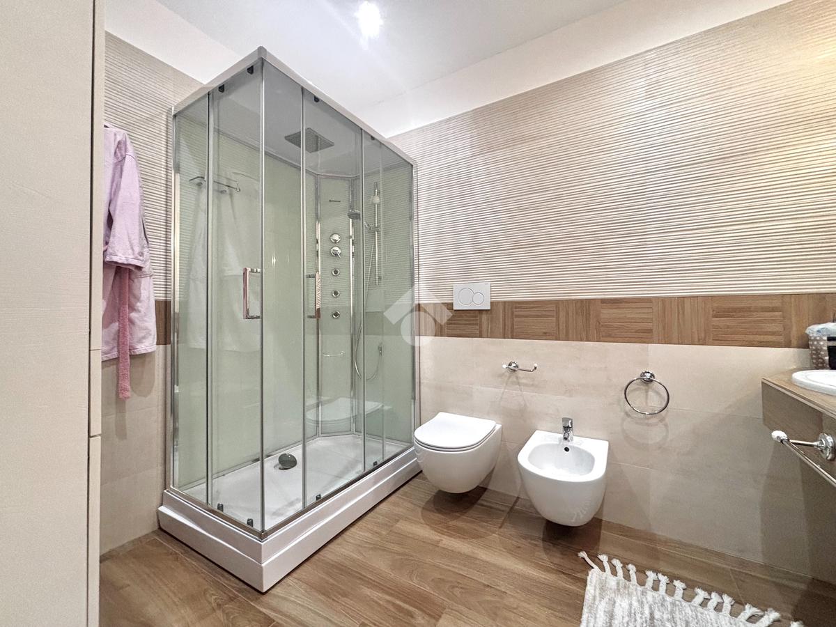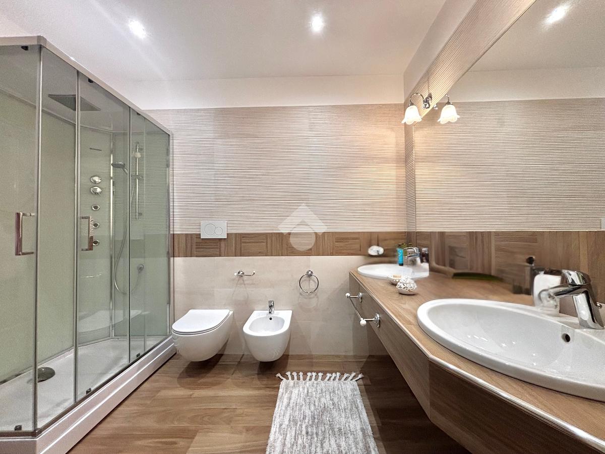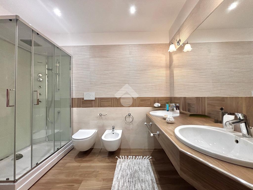 Infine, il bagno padronale, dotato di un ampio box doccia multifunzione e doppio lavabo, rappresenta un'oasi di comfort e raffinatezza.