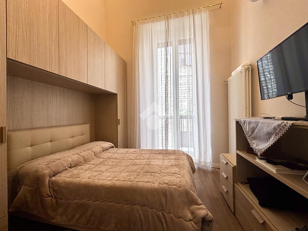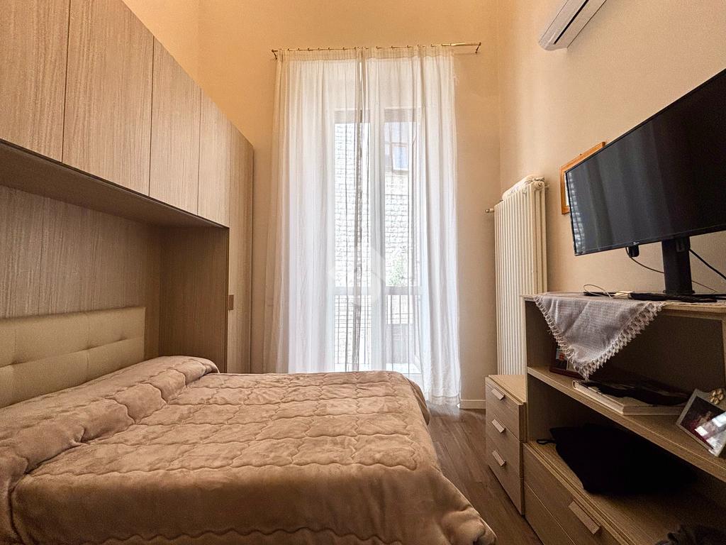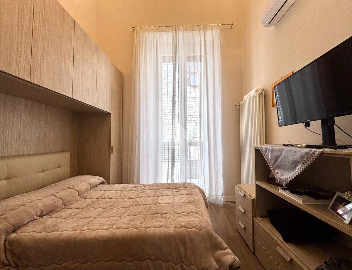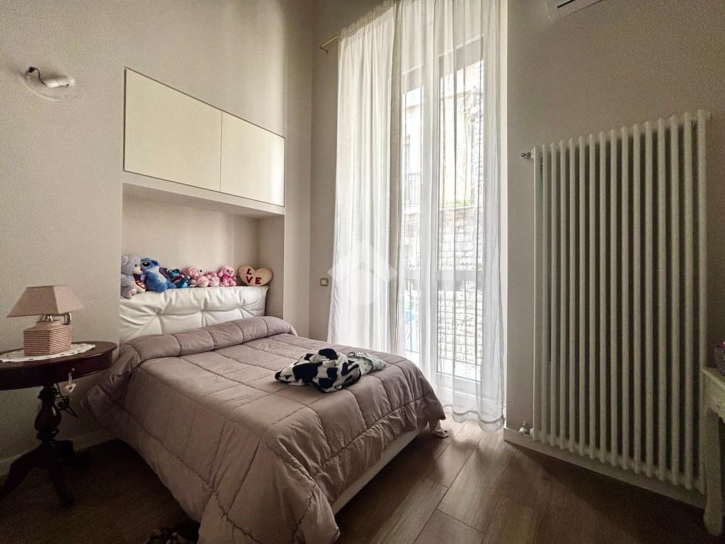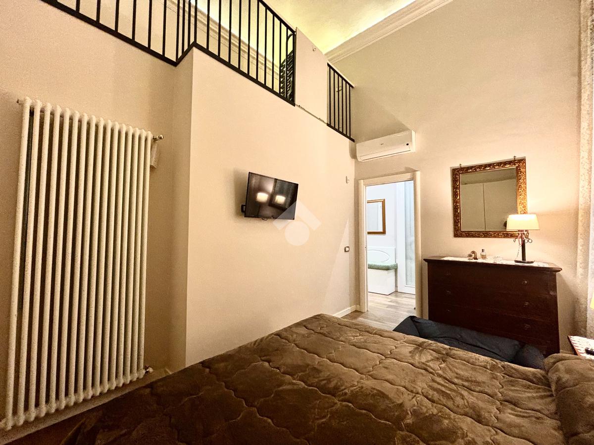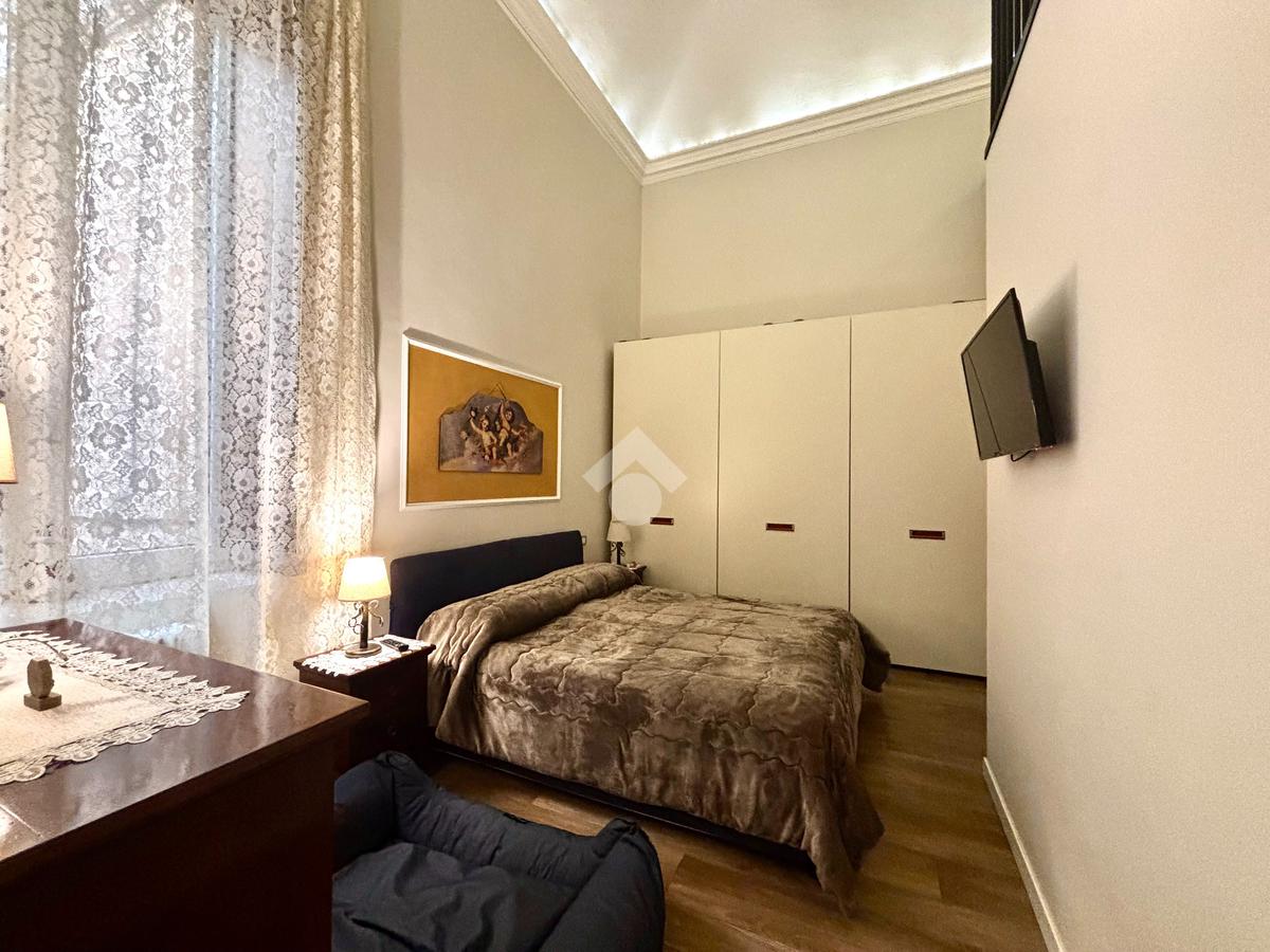 Proseguendo, troviamo il primo dei due bagni, un elegante ambiente con sanitari sospesi e un moderno box doccia multifunzione, ideale per il benessere quotidiano. Il corridoio conduce poi a due camere da letto di dimensioni simili, entrambe con affaccio sulla storica Via del Carmine. Anche in queste stanze si ripetono le suggestive volte alte e la presenza di soppalchi, che arricchiscono l'architettura dell'appartamento.